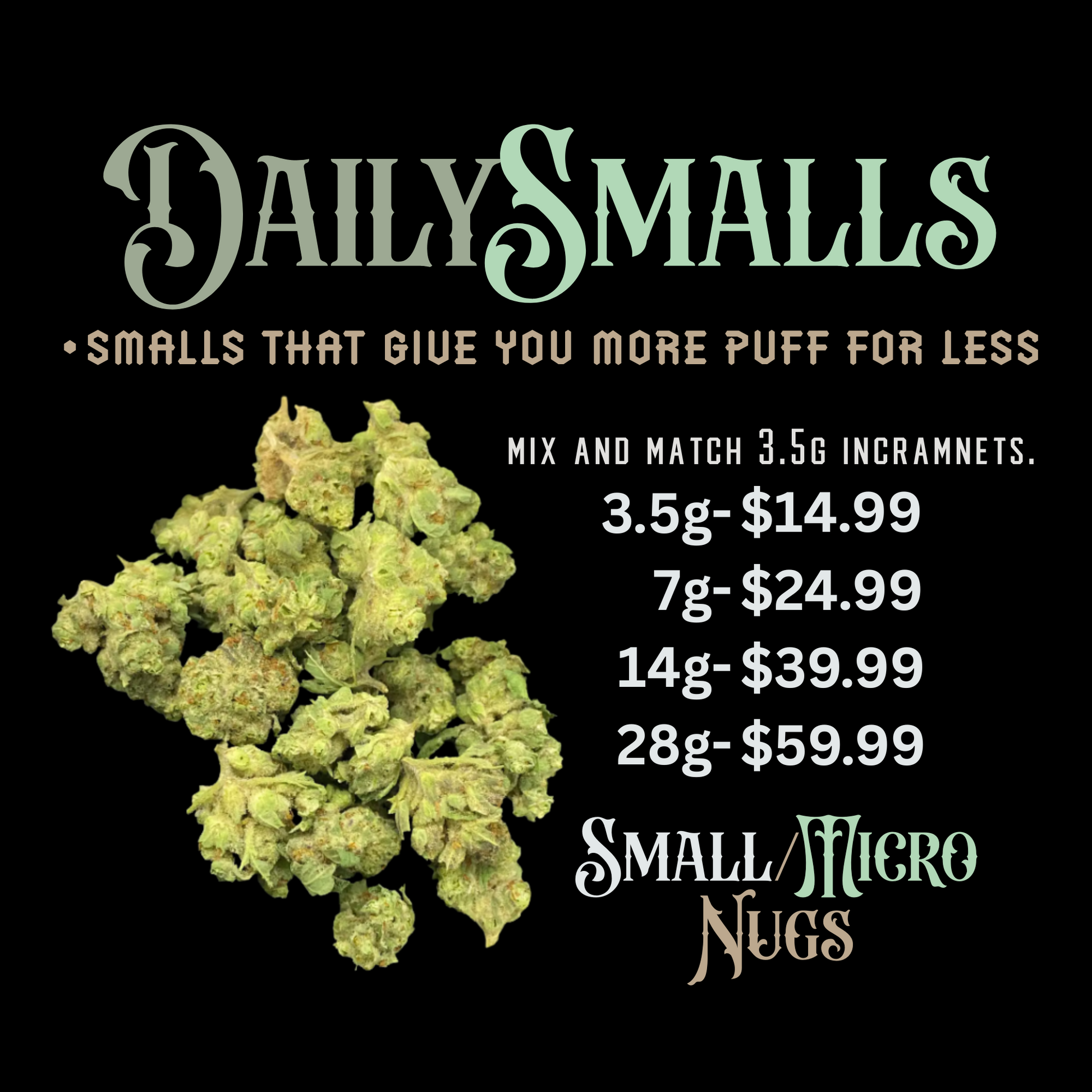 Expect small to micro nugs that still deliver full flavor, smooth smoke, and dependable effects. Perfect for rolling, packing bowls, or stocking up without breaking the bank.